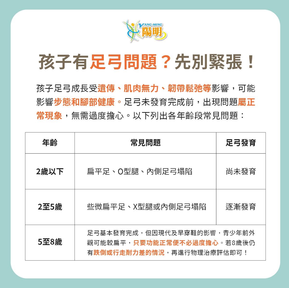 因現代小孩及早穿鞋的影響,到青少年前足弓外觀都可能較扁平,只要 #功能正常便不必過度擔心。若8歲後仍有 #跌倒 或 #行走耐力差 的情況,再進行物理治療評估即可!