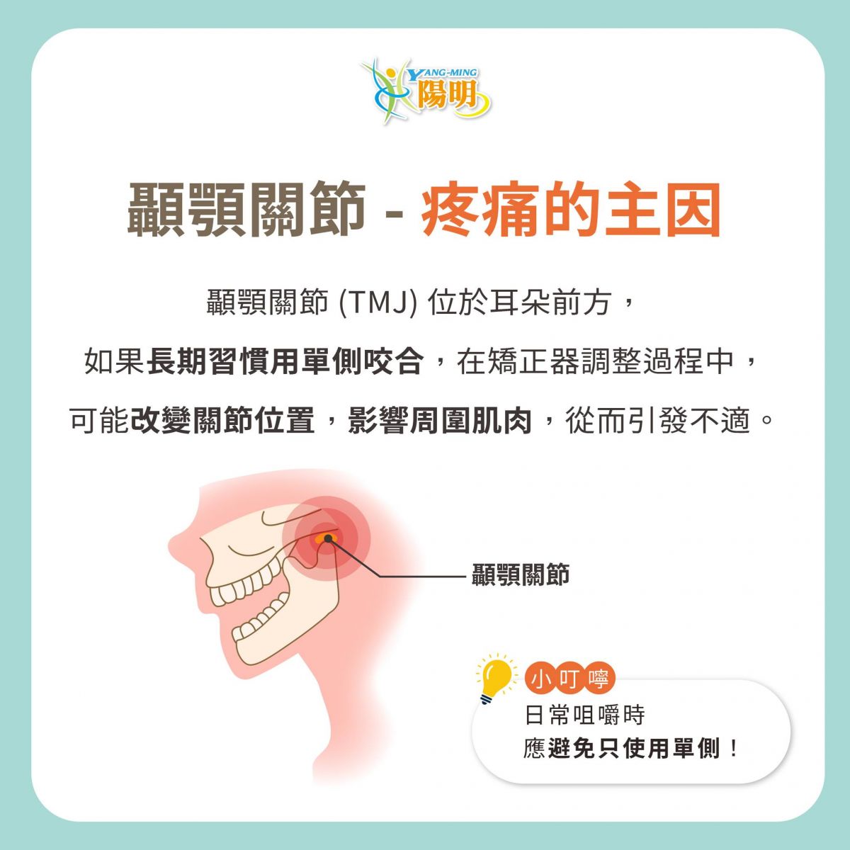 顳顎關節 (TMJ) 位於耳朵前方,如果長期習慣用單側咬合,在矯正器調整過程中,可能改變關節位置,影響周圍肌肉,從而引發不適。