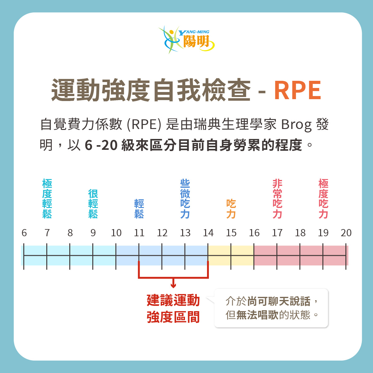所以需要評估運動強度是否合適,這裡分享由瑞典生理學家Brog發明的 #自覺費力係數 來檢測你目前的運動強度。
