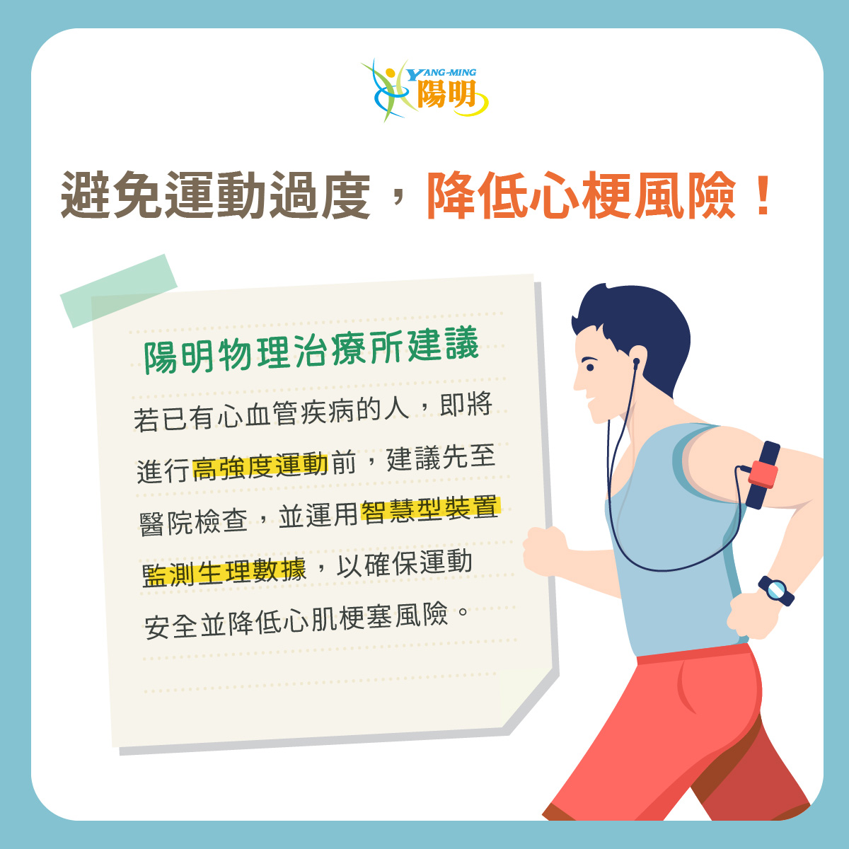 若本身是心血管疾病的⾼⾵險族群,在提升運動強度前,建議先至醫院做 #心電圖 #運動心肺測試 等檢查,並善⽤智慧型裝置,即時監測⾎壓、⼼率、SPO2與⾎糖等生理數據。